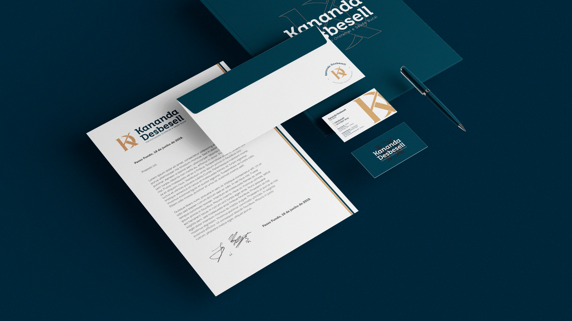 Kananda Desbesell é dentista, seu trabalho é focado em saúde bucal e harmonização orofacial. As inicias da cliente foram base da criação da marca, que, por solicitação da mesma, não gostaria de usar outros símbolos além de suas iniciais.